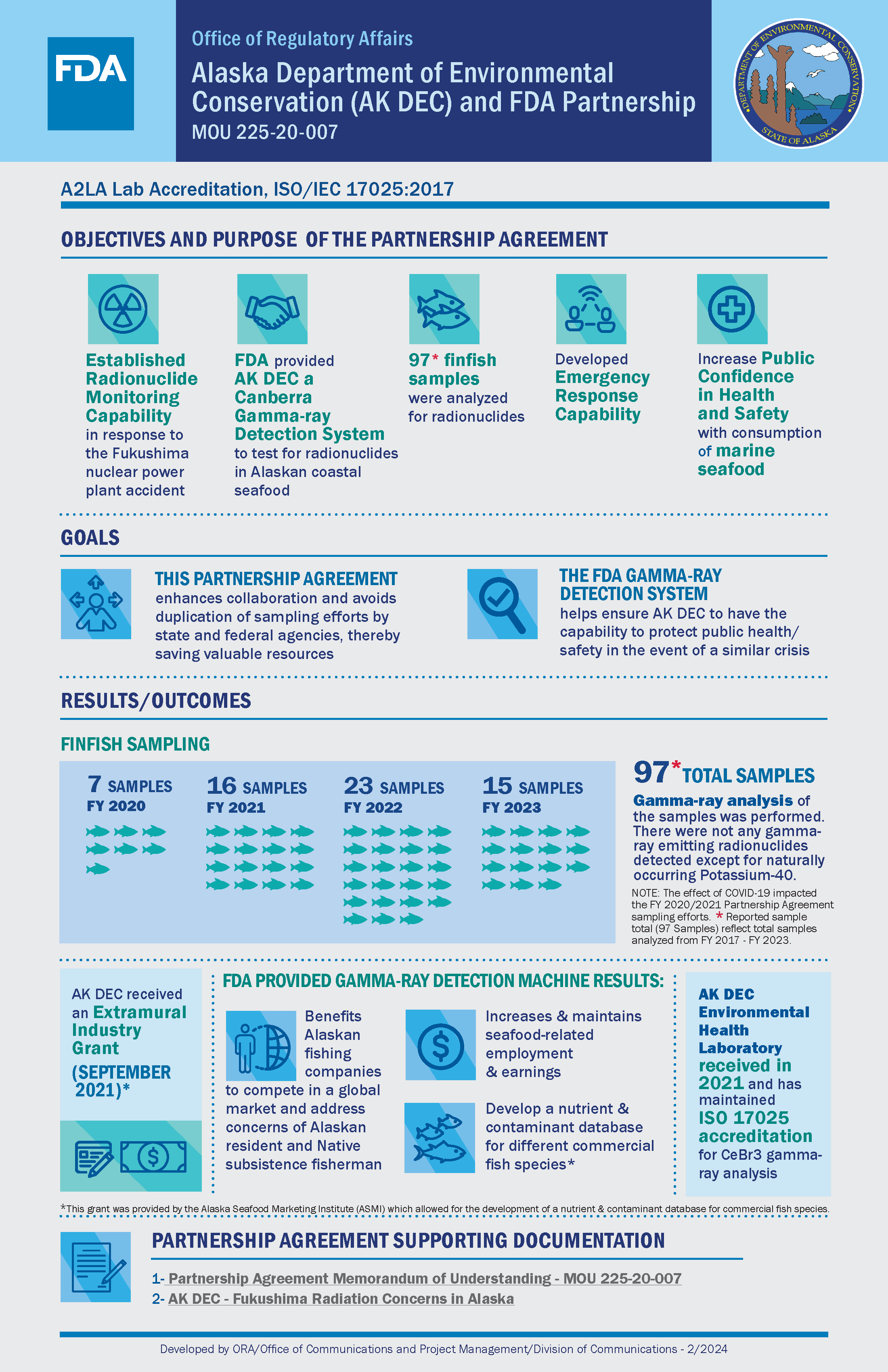 - February 2024 – The FDA worked with the Alaska Department of Environmental Conservation Laboratory to update an infographic highlighting the accomplishments from FY2017-FY2023 of their Specialized Partnership Agreement, in which Alaska analyzes radionuclides on the FDA’s behalf.