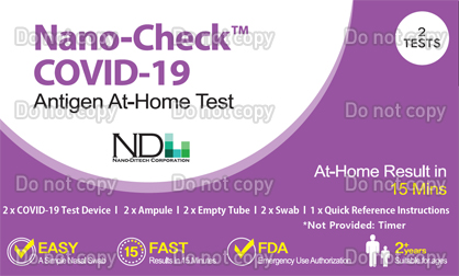Nano-Ditech Corporation: Nano-Check COVID-19 Antigen At-Home Test | Fecha de vencimiento: Consulte la etiqueta de la caja | - Personas con síntomas que comenzaron en los últimos 6 días. La prueba se debe realizar dos veces durante tres días (prueba en serie).