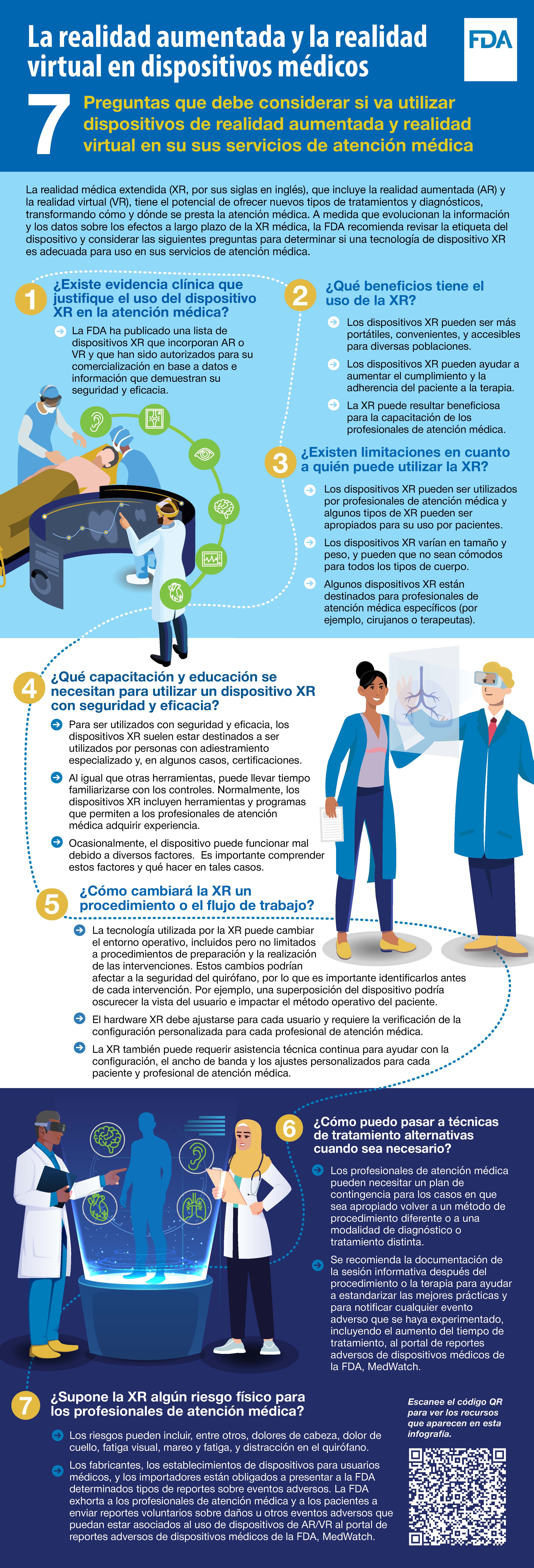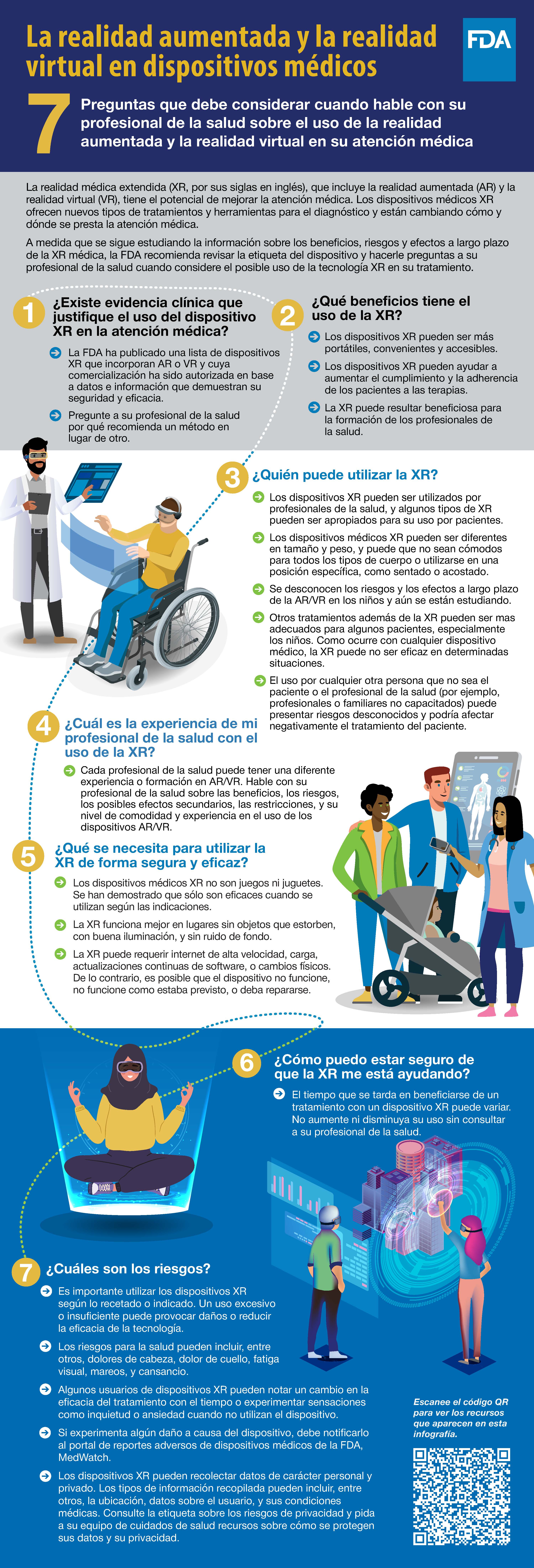 Si usted es un paciente, cuidador, o profesional de la salud que está considerando usar la Realidad Aumentada (AR, por sus siglas en inglés) o la Realidad Virtual (VR) en su atención médica o en su práctica, la Administración de Alimentos y Medicamentos de los EE. UU. (FDA) publicó estas infografías para ayudarle a considerar algunos de los beneficios, riesgos, y a tomar una decisión informada antes de utilizar dispositivos médicos AR o VR.