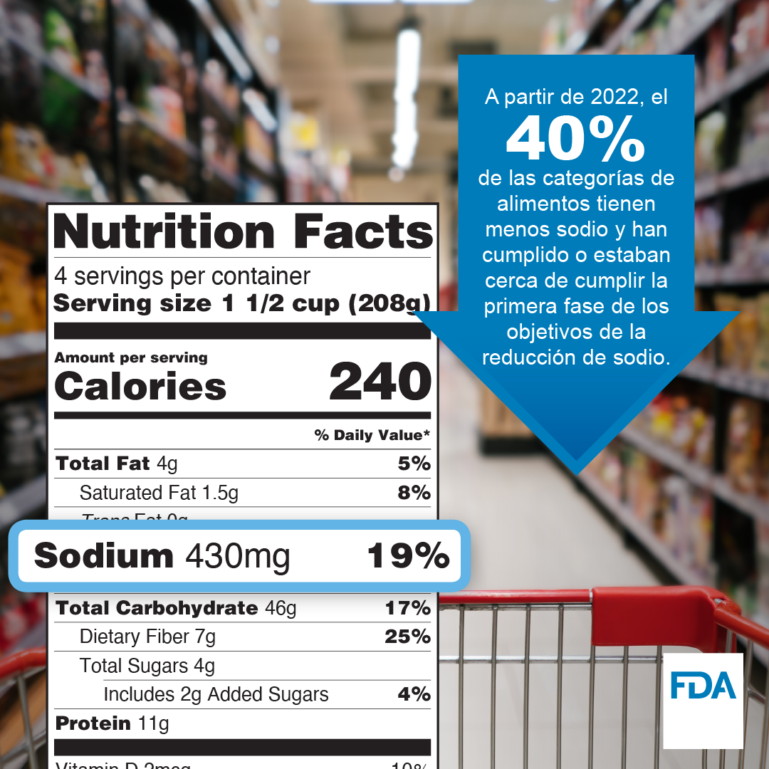 Hoy, la Administración de Alimentos y Medicamentos de los Estados Unidos (FDA, por sus siglas en inglés) ha anunciado un logro importante en el desarrollo de la Fase I y los objetivos voluntarios de reducción de sodio y publica una guía preliminar para la Fase II con un enfoque gradual basado en datos para ayudar a reducir el sodio (en inglés) en el suministro de alimentos. Antes de 2021, la ingesta de sodio de los consumidores era de aproximadamente un promedio de 3,400 miligramos al día, muy por encima del límite recomendado por las Guías Dietéticas para los Estadounidenses de 2,300 miligramos al día para los mayores de 14 años. Si la guía se aprueba, el nuevo conjunto de objetivos voluntarios permitiría reducir la ingesta promedio de sodio a unos 2,750 miligramos diarios. Esta reducción es aproximadamente un 20 % inferior a los niveles de consumo anteriores a 2021.